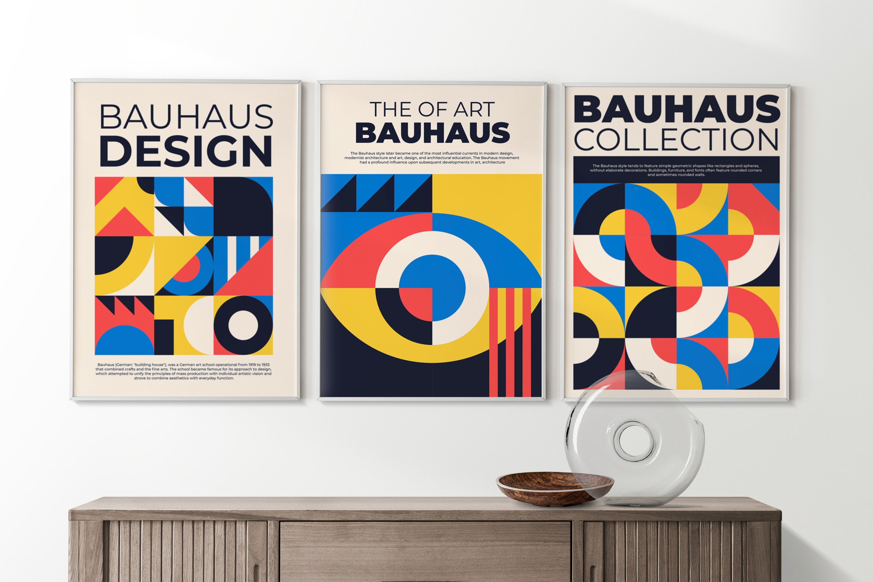 Image Caption: Bauhaus design posters with geometric forms & bold colors
